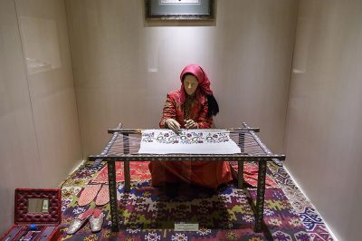 İşleme ve dokuma sanatının özel örnekleri de burada bulunuyor. Müzede, insanların yaşadıkları evlerde ve ortamlarda, yerlere ve duvarlara serdikleri, dekoratif amaçlı kullanılan çok iyi süslenmiş halı ve kilimler de yer alıyor. İlgililer için, günümüze kadar kullanılmış halı motifleri tek tek anlatılıyor. Doğurganlığı simgeleyen Eli Belinde, gücü simgeleyen Koç Boynuzu, ölümsüzlüğü simgeleyen Hayat Ağacı, insan ruhunu simgeleyen Kuş Motifi halılarda kullanılan temel motiflerden.