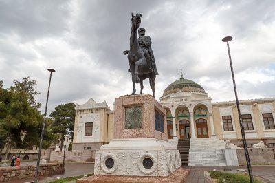 Binanın bahçesinde, atlı heykeller konusunda usta İtalyan heykeltıraş Pietro Canonica tarafından yapılan bir Atatürk heykeli bulunuyor. Pietro Canonica, İstanbul’daki Taksim Cumhuriyet Anıtı‘nı yapan kişi olduğu için tanıdık geliyor olmalı. 1928 yılında müzeyi ziyaret eden Atatürk, müzeyi beğenmiş, eser toplamak ve satın almak üzere gerekli komisyonun kurulmasını buyurmuştur. Müzedeki eserler 1930 yılına kadar toplanmış ve halkın ziyaretine açılmıştır.