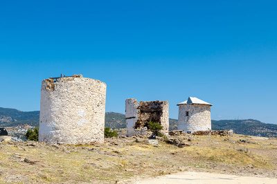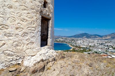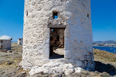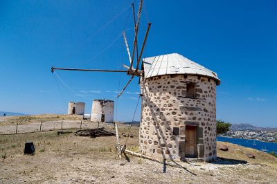 18. yüzyılda inşa edilen ve 1970’li yıllara kadar kullanılan yel değirmenlerinin içlerine kadar girip yakından inceleyebilirsiniz. Ocak ayında üzerindeki yazıların yeniden boyanarak yok edilmiş olmasına rağmen, bahar ayında değirmenlerin birisinin içine girdiğimde bir şeyler yazılı olduğu gördüm. Bazı kendini bilmezler tarafından yazılmış yazılar olsa da, taştan yapılmış bu yel değirmenlerini ziyaret etmek çok güzel. 1970’den sonra işlevini motor gücüne bırakan Bodrum’daki yel değirmenleri, bulunduğu tepelerden çıkarılan taşlar kullanılarak inşa edilmiş. Ancak, bu kadar kısa sürede yel değirmenlerinin yalnızca bir tanesinin günümüze gelip, diğerlerinin heba olması anlaşılabilir bir durum değil. Aralarında yalnızca birinin pervaneleri bulunuyor. Pervaneli yel değirmeni de, ziyaretçilerin yaklaşmaması ve zarar vermemesi için çitlerle çevrilmiş.